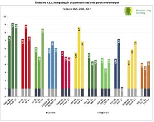 Het Haags Groen Keurmerk is door de Bomenstichting Den Haag in het leven geroepen om politieke partijen te stimuleren om het Haagse groen te behouden en te versterken. Het is een handig hulpmiddel in aanloop naar de verkiezingen op 18 maart. De stichting heeft het stemgedrag van de Haagse partijen over 2025 met betrekking tot groene onderwerpen in een tabel gezet, gewogen, beoordeeld en gerangschikt. Deze terugblik in het recente verleden geeft – aanvullend – een mooi inzicht naast de verkiezingsbeloften voor de komende jaren.